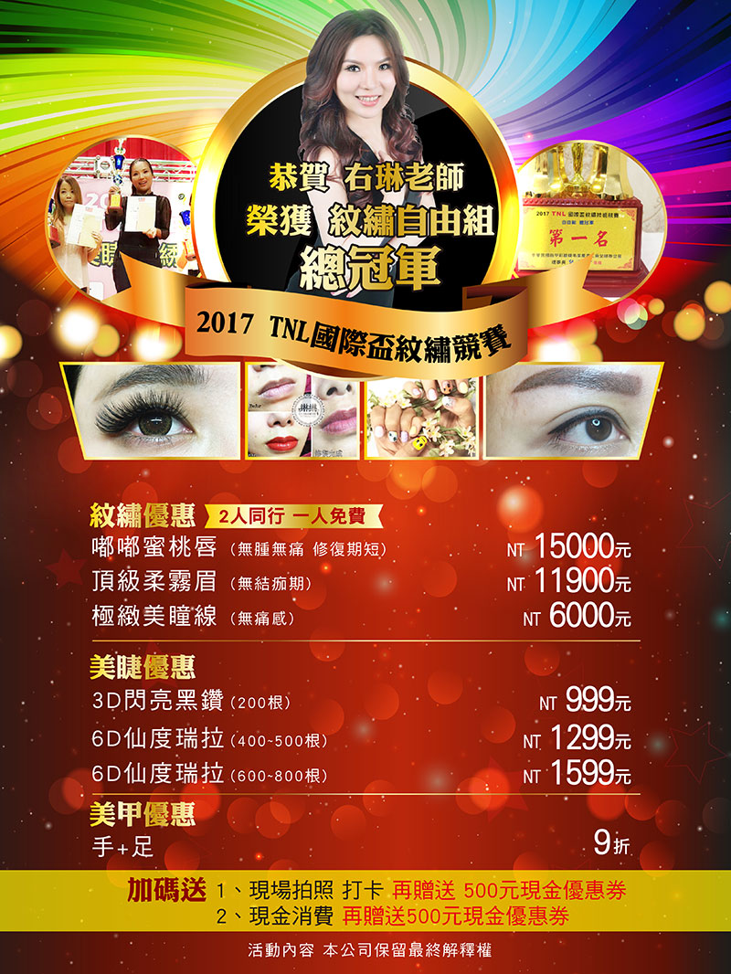 累積多年開業經驗右琳老師。不但擁有多項證照,舉凡中華民國美容技術士合格,中華民國TNA二級美甲技術士合格,救國團授邀美睫、霧眉講師,TNL紋繡檢定評審、韓國美業國際評審,PTIA美睫教練師評審,ICBA全國眉藝絲繡教練師,國際紋藝大賽評委,美容同業公會 會員,美睫眉藝造型職業工會 會員等,更是台南名店綝綝美甲美睫紋繡學院幕後操盤手。結合實際開業經驗與無私的傳授各方面技巧。