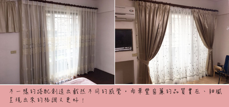 「華豐」窗簾成立於民國75年,擁有30多年的專業窗簾經 驗,以及業界有口皆碑地精緻車工。許多窗簾大盤商只要承接到要用進口高級窗簾布料來製作的CASE,就會委託「華豐窗簾」來製作,可說是外國頂級窗簾布、 窗紗的專業代工廠。所以華豐窗簾會是顧客除了隆美窗簾之外的第一選擇喔!