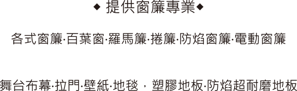 提供窗簾專業:各式窗簾‧百葉窗‧羅馬簾‧捲簾‧防焰窗簾‧電動窗簾‧舞台布幕‧拉門‧壁紙‧地毯‧塑膠地板‧防焰超耐磨地板。一通電話專人免費到府估價。免費安裝 , 免費車工,軌道、S鉤的配件永久保固。亞拓窗簾,保證 台灣織造,國家標準SGS安全認證,不含甲醛。歐盟認證紡織品。