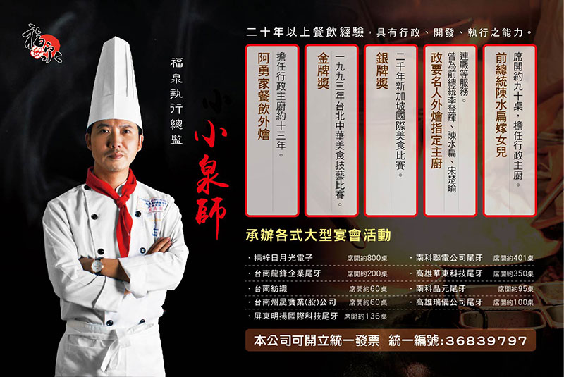 總統認證ㄟ國宴級主廚–「吳嘉宏總鋪師–小泉師」絕對是您外燴、辦桌、婚宴、尾牙的第一首選!曾任「陳前總統千金喜宴行政主廚」、「李登輝前總統、連戰前副總統、前省長宋楚瑜宴會指定主廚」,集結近30年來的豐富經驗,福泉食味不把精緻化當口號,每一口都要讓精緻吃的到!辦桌、辦外燴不只要客人吃的「飽飽飽」,更要吃的「好好好」!