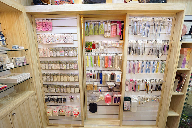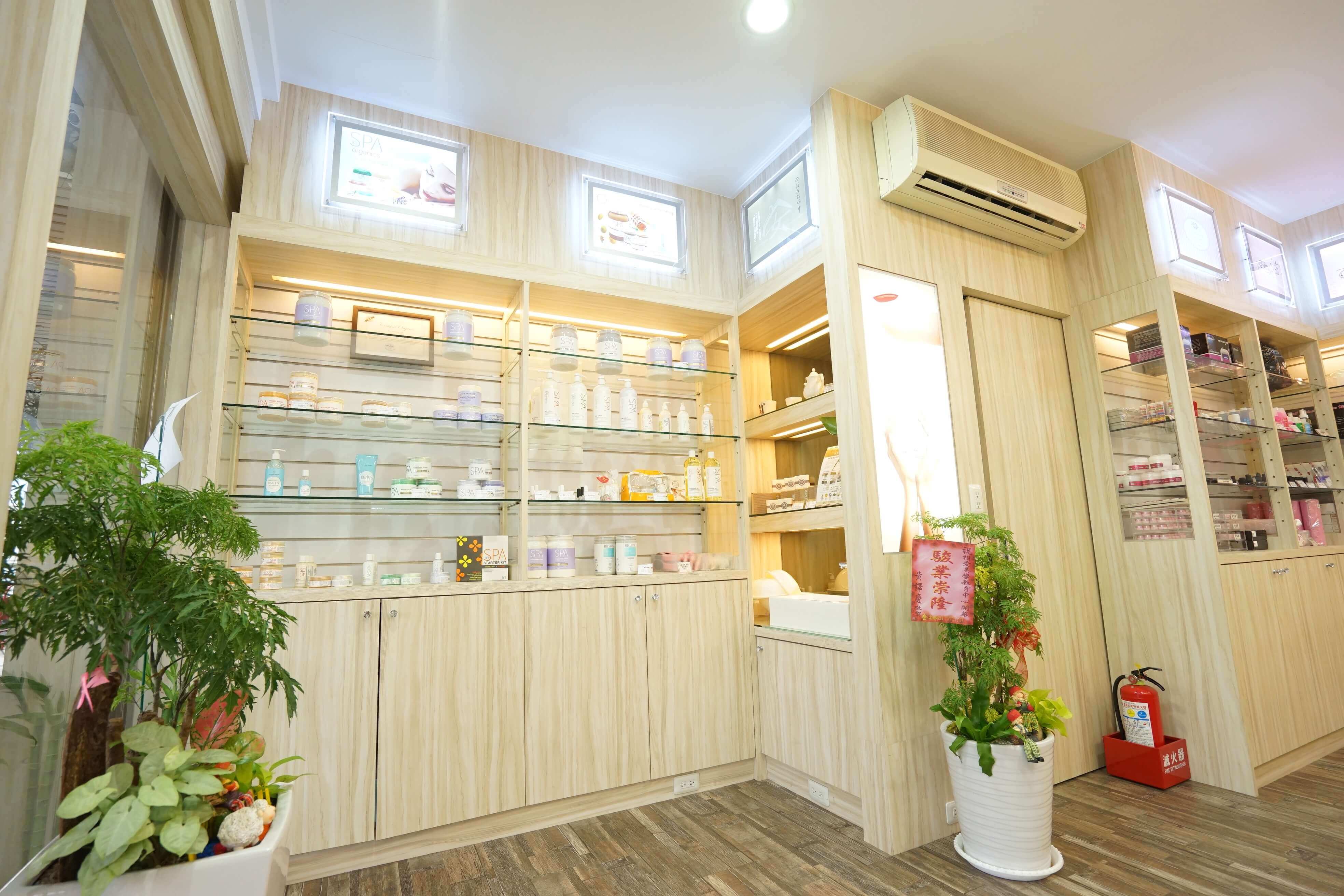 充滿木色簡約乾淨的裝潢,整齊擺放著許多美甲美睫的相關產品,提供大家來店選購。