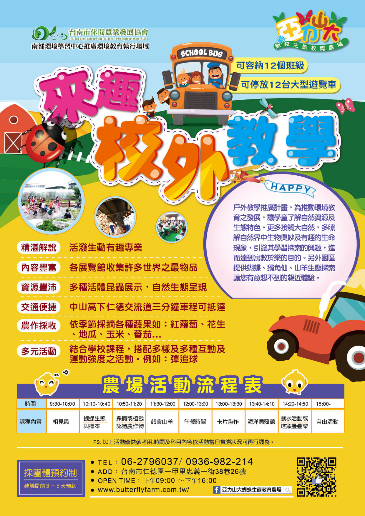 為了推廣生態教育研習課程,『亞力山大蝴蝶生態教育休閒農場』承辦行政院職訓局辦理生態教育種子講師研習營,針對幼教師的師訓來安排『生態.藝術.管理.律動』等相關課程 課程規劃旨在1.強化幼師的教學能力和專業成長2.提升教師運用多元素材,活化表演藝術教學,給予孩子們完整的身心刺激與引導。課程包括:發現蝴蝶之美/台灣昆蟲之最—四大金剛/草原殺手—螳螂/最溫馴的羊咩咩/開心農場探索/蝴蝶園的營造等等。期待讓我們的孩子多多親近自然,領略綠意盎然間的生態之美。 ![]() 亞力山大台南休閒農場的特色 *生態資源豐富,觀賞與教學皆宜,最適合戶外教學、親子旅遊 *生態園區設計規劃與諮詢 *不定期舉辦昆蟲營隊活動 *蝴蝶生態演講教學 *設有罕見大型昆蟲標本館 *誘蝶植物批發零售 *提供獨角仙、鍬形蟲、金龜子、蝴蝶等昆蟲飼養觀察