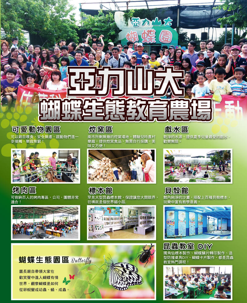憑券: 20人以上訂購農場焢窯乙餐或烤肉餐,每人贈送古早味吧噗一支!! 亞力山大蝴蝶生態戶外教學教育休閒農場位於台南縣仁德鄉一甲村,五千多坪的台南休閒農場內有海洋貝殼化石展覽館、小動物餵食、蔬果採收和烤肉地點、環保控窯區等;但以蝴蝶收藏最為豐富,能實地觀察了解蝴蝶的食蜜植物、生長過程和不同種類相當完善,非常適合各級學校,戶外教學。