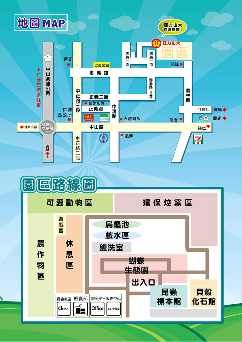 [費用簡介] 國道一號仁德交流道下,往仁德方向直行,於中正路上第一個紅綠燈左轉,行至仁德區公所前,即有指標可達亞力山大台南休閒農場。
