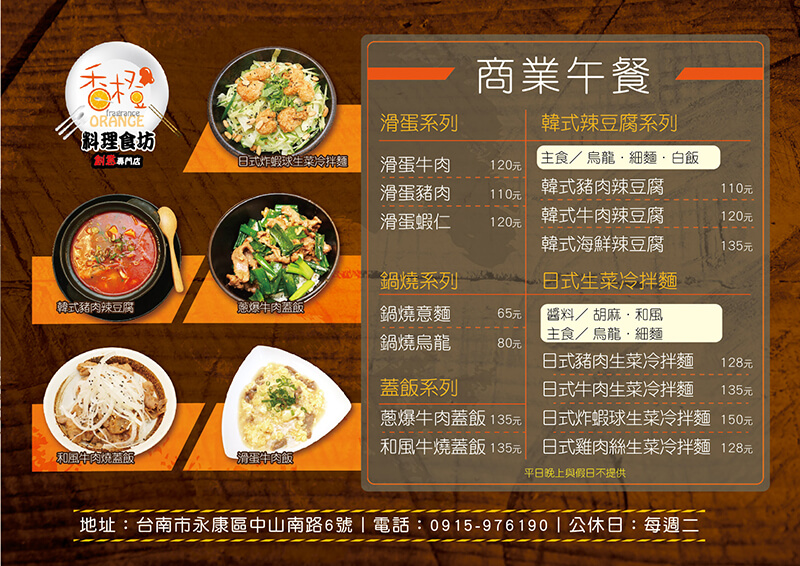 香橙料理食坊的位置算是永康鬧區,周邊緊鄰崑山中學,附近有不少商店、公司,於是老闆開創商業午餐的菜單,希望讓客人在中午可以吃到經濟又實惠的料理。