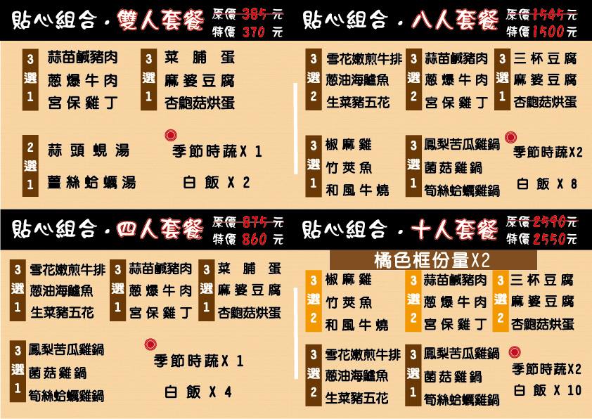 香橙的主廚喜歡變化菜色,雖有固定菜單,但也不定時推出各種不在菜單上的手路菜,如果你吃過肯定會愛上,那是專注的料理人才能做出的美味。此外,店內也提供多人合菜,不知道要吃什麼,就不妨讓老闆替您搭配好,有兩人、四人、八人和十人組合餐提供選擇,價格更加實惠喔!