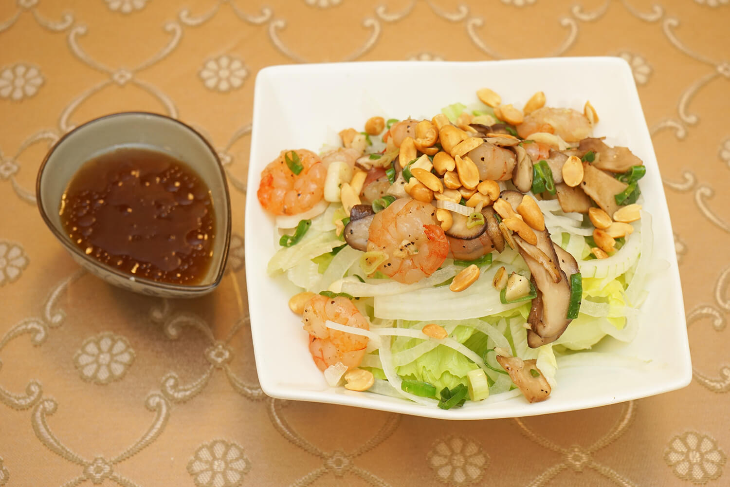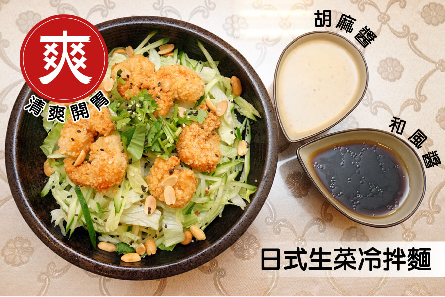 日式生菜冷拌麵,吃起來相當清爽開胃且份量十足的一道料理。主食可以選擇烏龍麵或細麵,搭配豬肉、牛肉、炸蝦球或雞肉絲擇一,醬料則有胡麻及和風可以選擇。