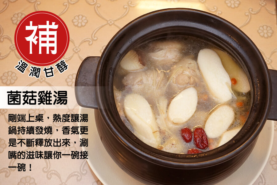 菌菇雞湯,以多種中藥材加上菌菇及新鮮雞肉下去做燉煮,湯頭溫潤回甘,雞肉也相當軟嫩,十分美味!