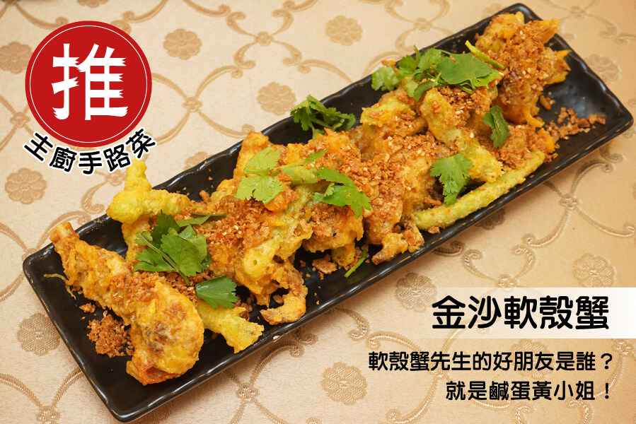金沙軟殼蟹,選用新鮮軟殼蟹裹粉炸至金黃色,加入鹹蛋黃下去做拌炒,外酥內扎實,且外衣均勻的被鴨蛋給包裹著,吃進嘴裡的鹹香滋味和那口感層次,微妙的襯托出軟殼蟹的鮮甜滋味,都是你必點的理由!