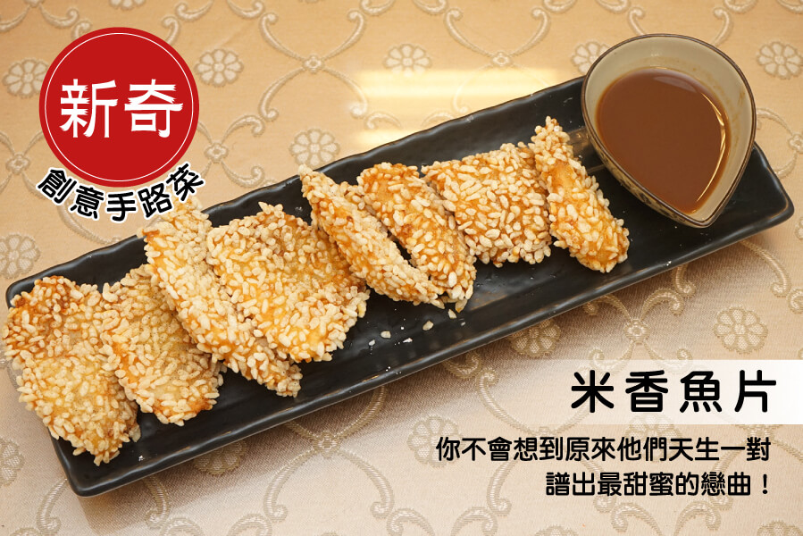 米香魚片:選用新鮮多利魚,裹上米香下去炸至金黃,吃起來的口感就像在吃爆米香,沾上旁邊的羅望子醬,吃起來酸酸的口感增添了幾分清爽。