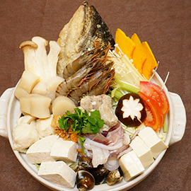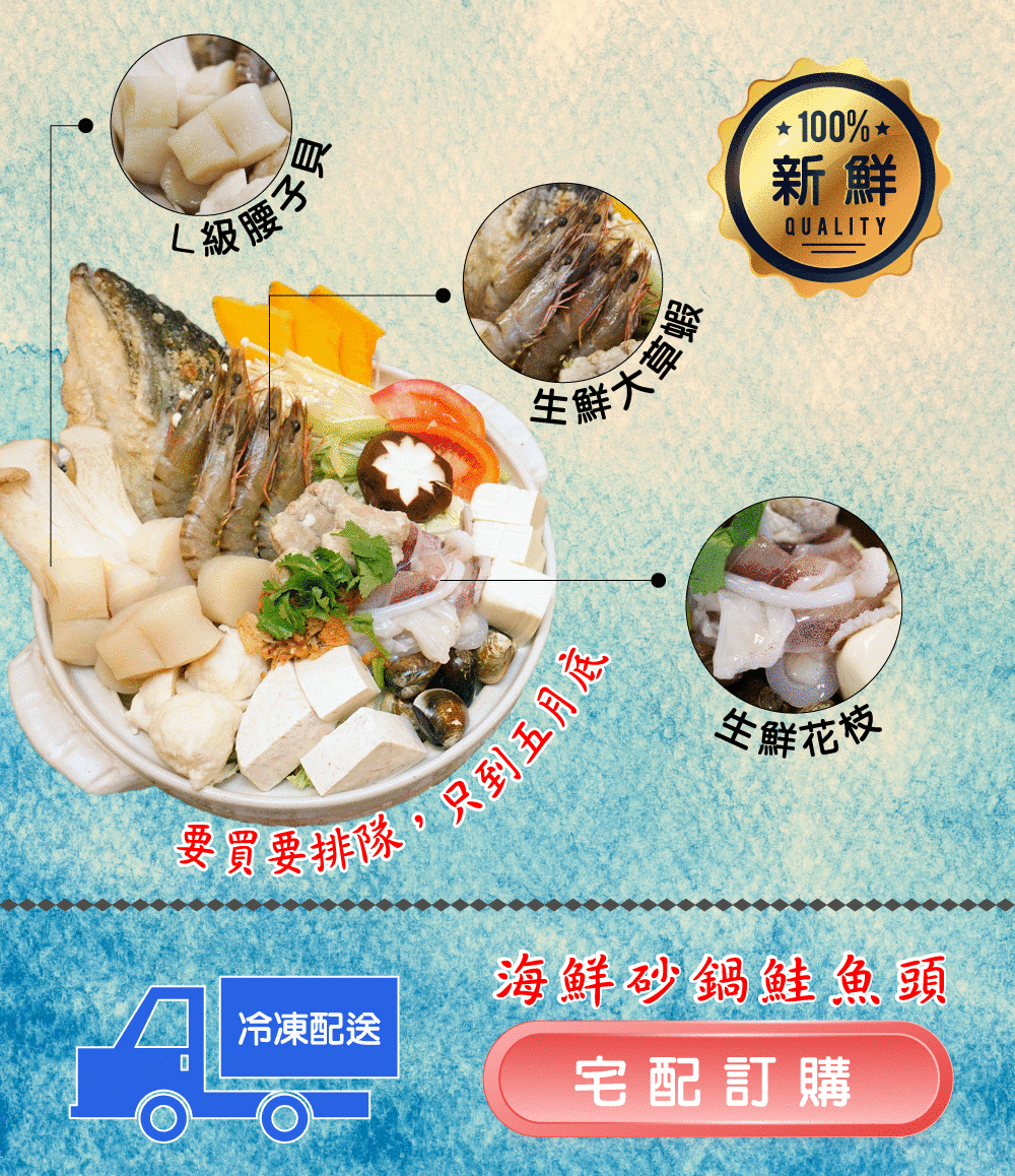 冬季限定的【鮭魚海鮮砂鍋魚頭】,一推出就大受顧客喜愛,是老闆不計成品的一道澎湃料理,實品就跟下圖一模一樣,塞滿各式新鮮海產和蔬果,有鮭魚頭、鮮干貝、生猛草蝦、鮮花枝和鮮蛤蜊...等多種食材,煮出海鮮的鮮甜味。