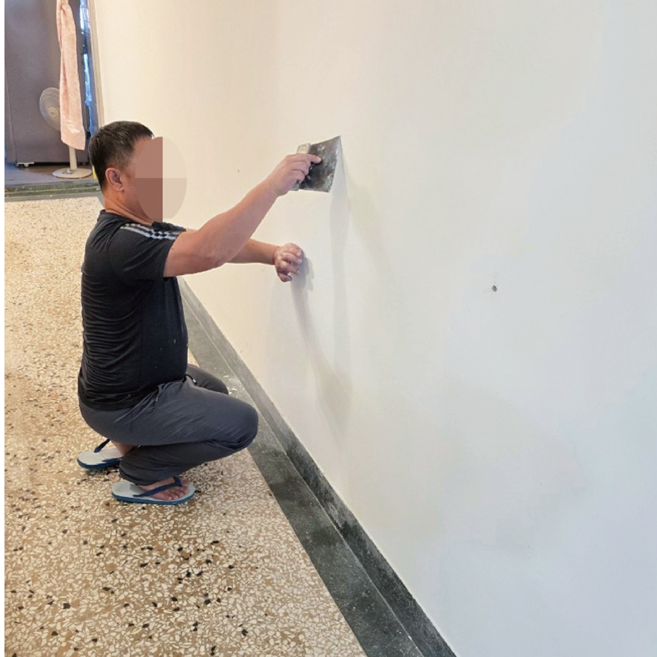 雖然一開始只是小塊白白的、粉粉的、龜裂小縫,但問了朋友推薦的胖匠油漆師傅才知道,這種狀況如果再放著不管,後面會越來越嚴重,不只牆壁會變成一片片剝落,看起來很可怕,還會影響呼吸系統,對阿公阿嬤的身體完全不OK。