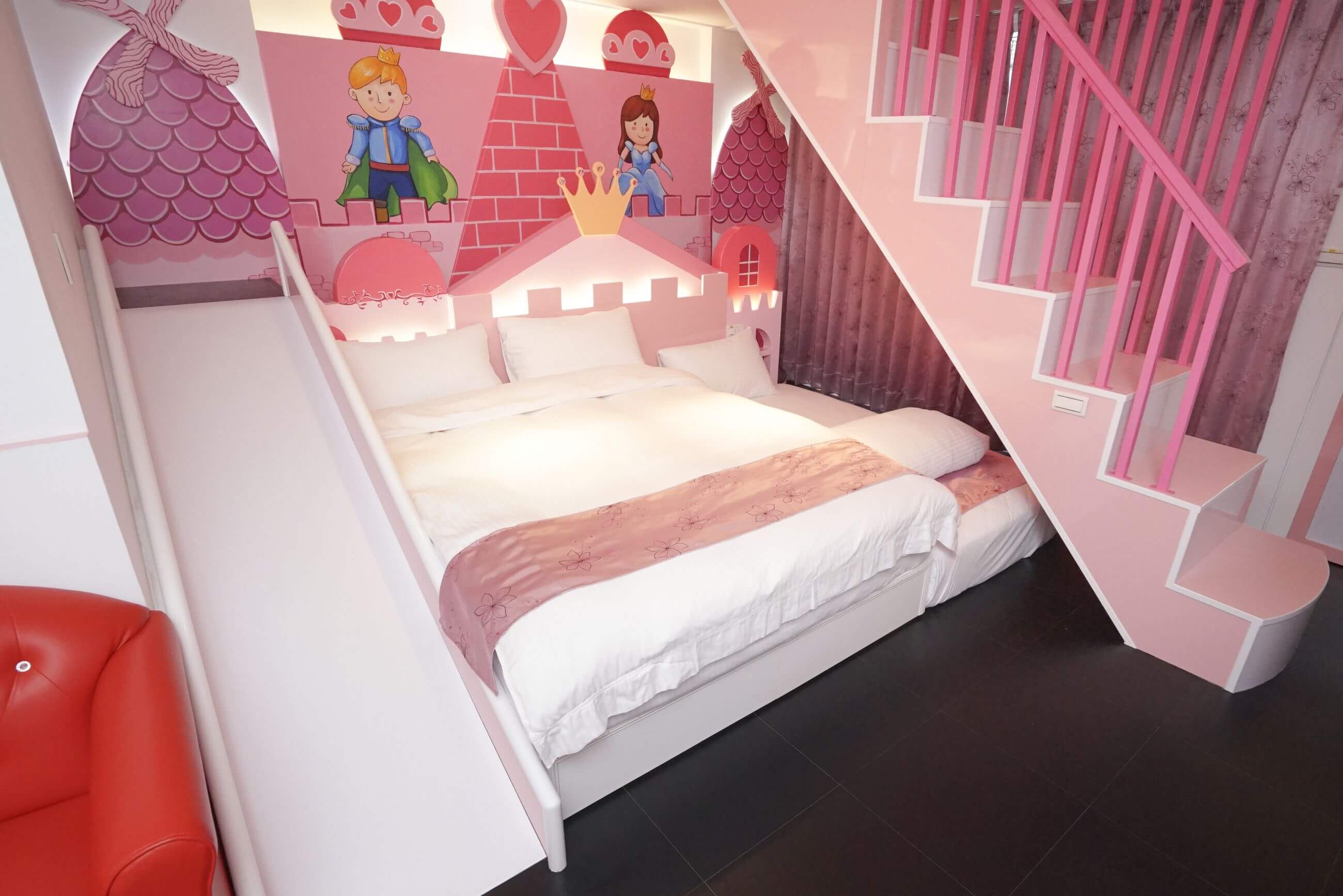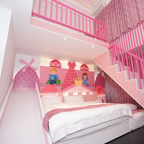 裝潢以粉色甜美的公主風為主,粉色要基調,配置了五人的住宿空間,地面及樓梯