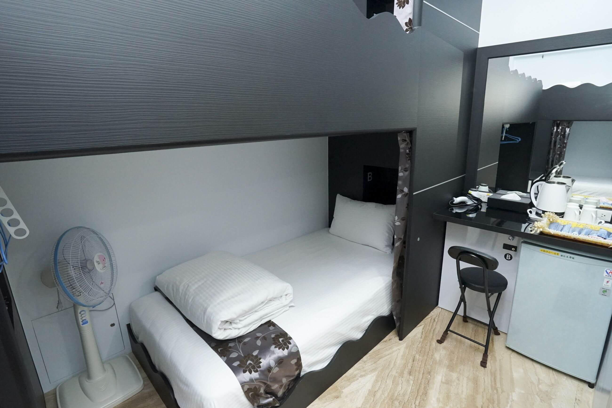 充滿現代感的時尚設計,房型雖小,設施俱全。電視、梳妝台、吹風機、電冰箱、電風扇、熱水壺、拖鞋等...各式日常用品應有盡有。