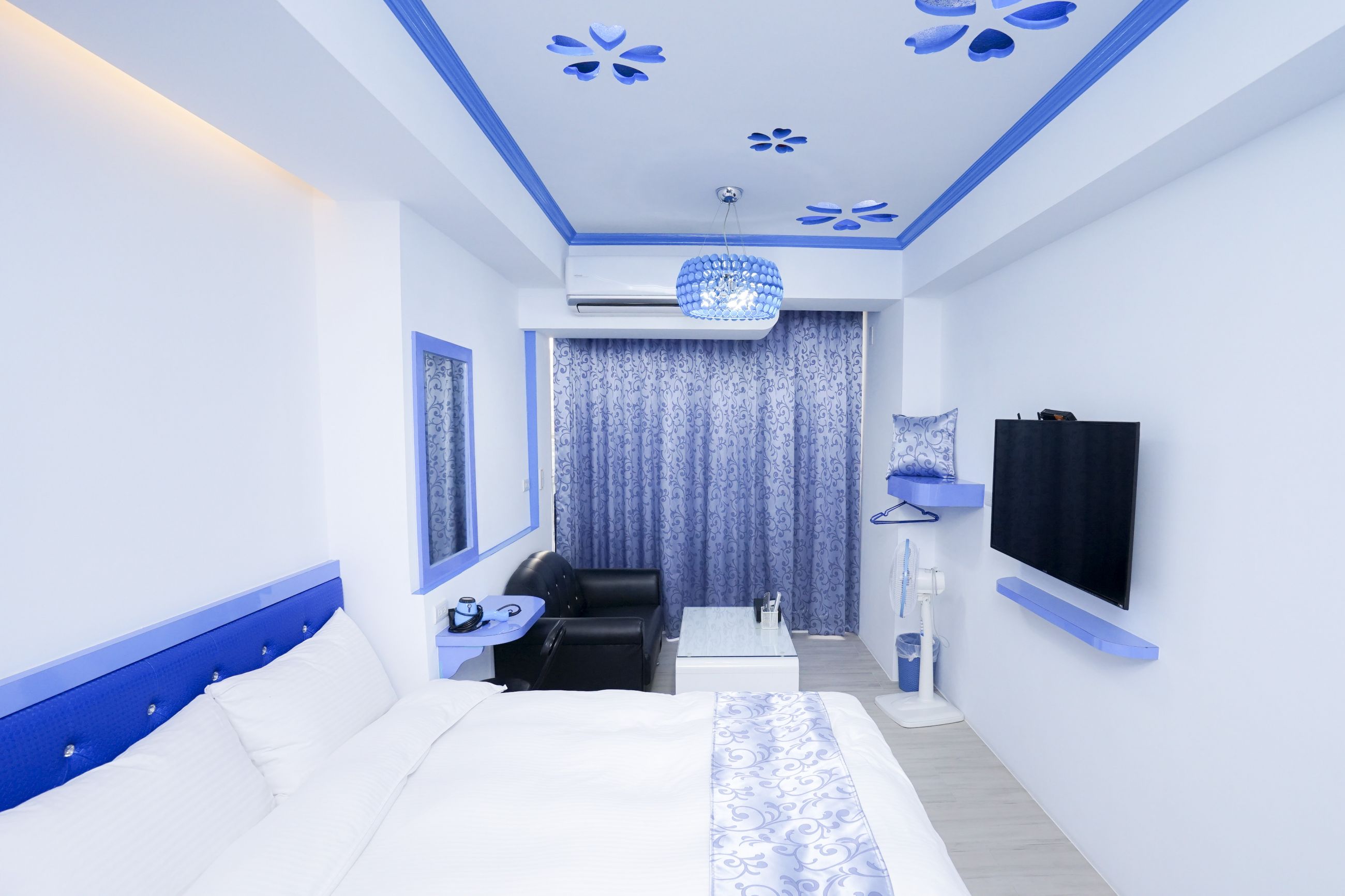 充滿清爽天空藍的時尚設計,天花板有藍色漂亮的幸運草裝飾點最,空間雖不算大但絕對精緻。電視、梳妝台、吹風機、電冰箱、電風扇、熱水壺、拖鞋等...各式日常用品應有盡有。