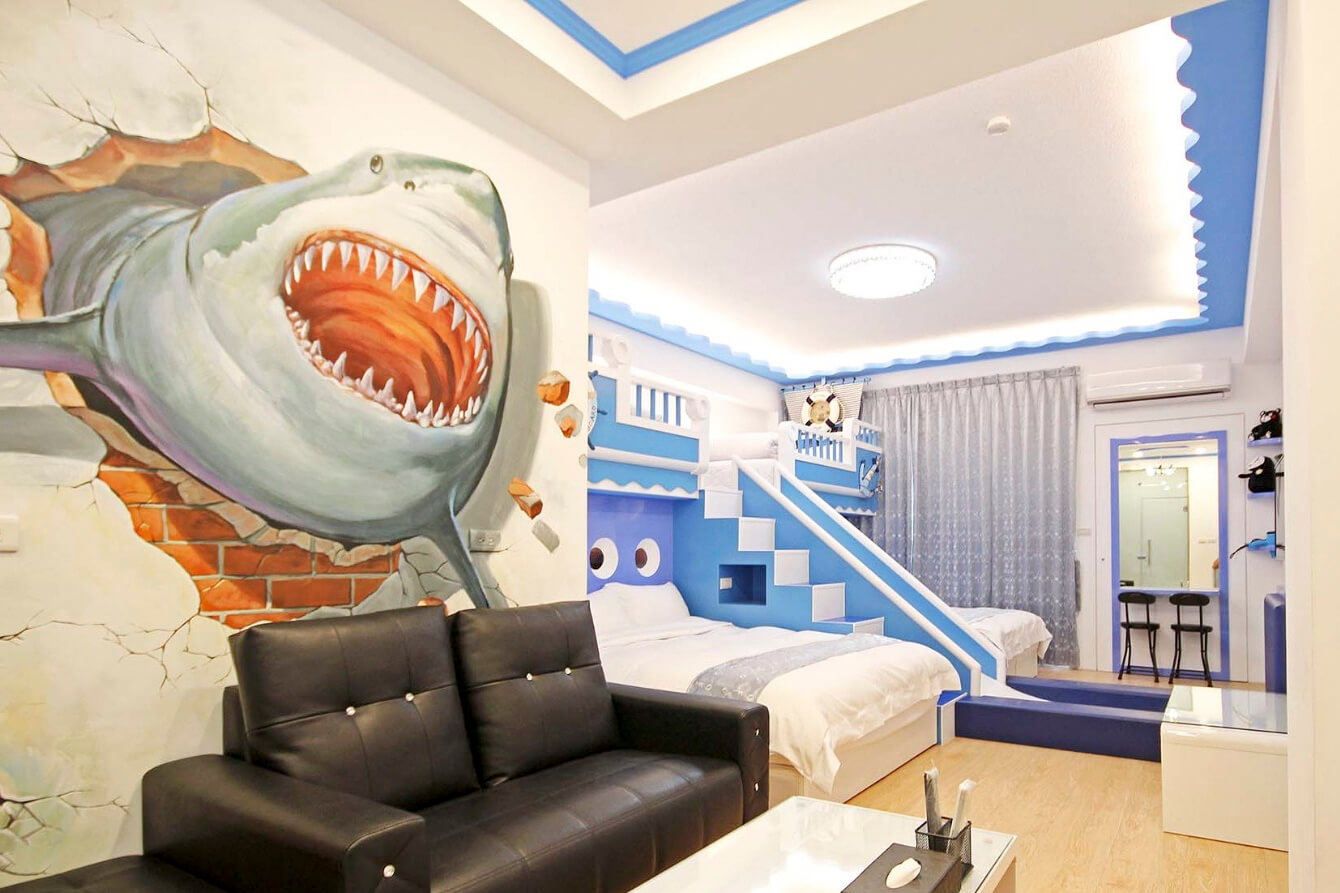 三樓是海洋風格為主,是六人套房,以藍色為主調,是專為大家庭或一群朋友出遊所設計。