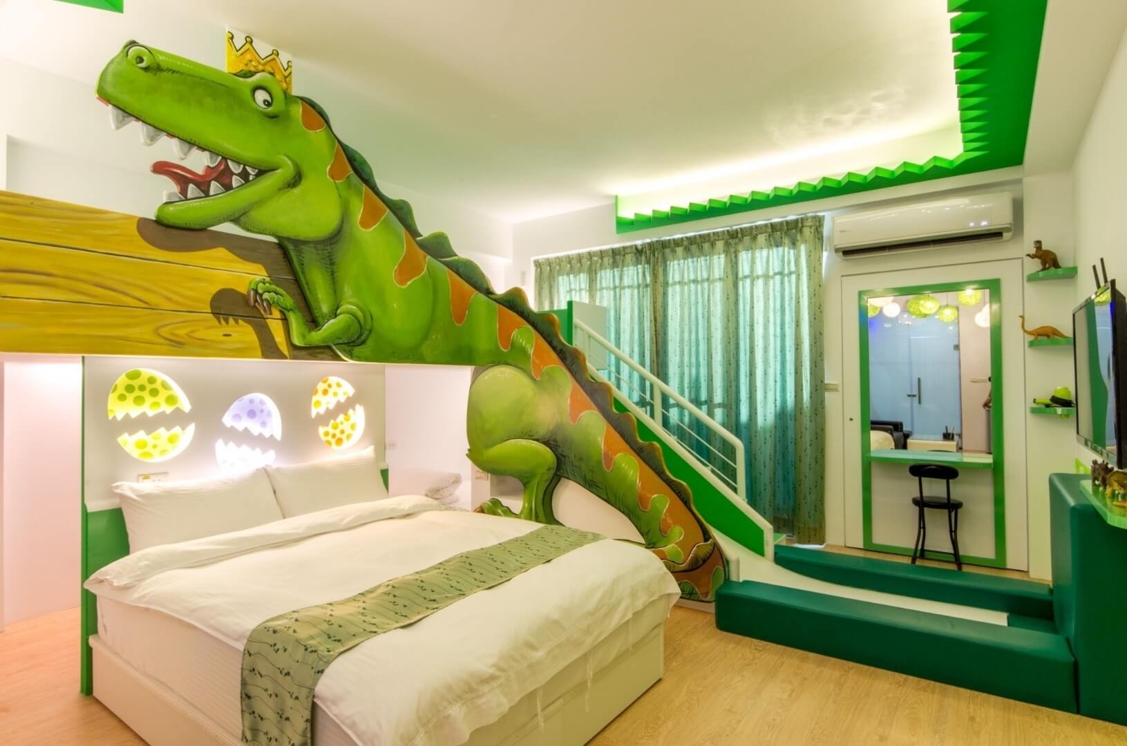 四人房型以恐龍為主題,以綠色為主調,配置了各式的恐龍圖案裝飾及設計,
