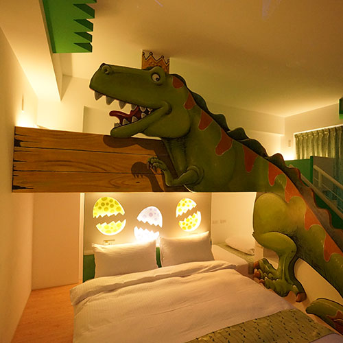 並配有恐龍造型的玩具及童書,讓喜愛恐龍的客人們留下難忘的住宿經驗,充滿童趣。